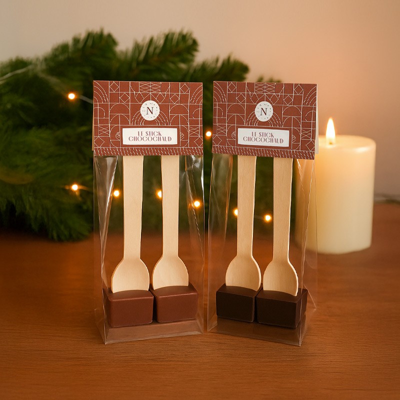 Nous proposons pour la première fois une collaboration festive avec des sticks en chocolat brun ou noir qu’il suffit de plonger dans du lait chaud pour profiter d'un moment totalement réconfortant.